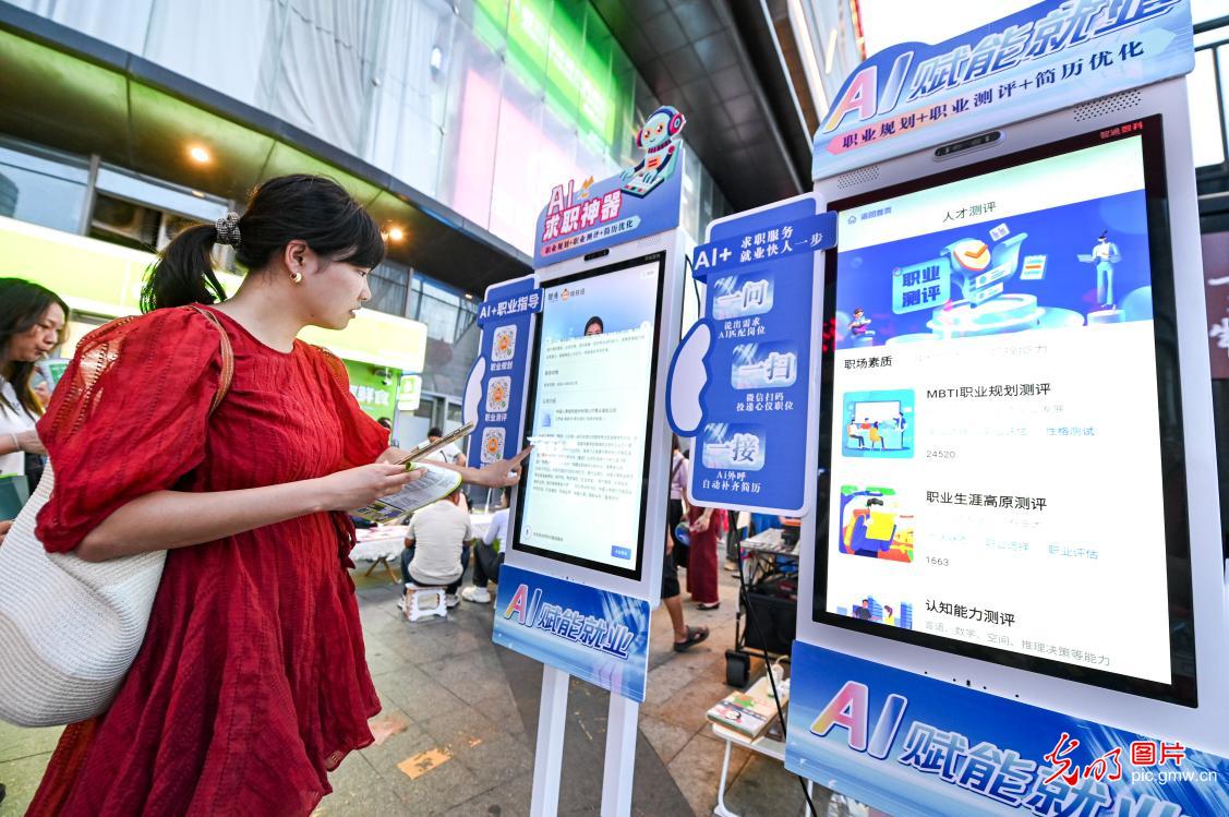 前者有15家企业参会,全力推进青年群体就业。图为招聘者正在体验AI简历优化办事。供给374个岗亭,图为求职者正在征询、招聘。(富摄/图片)