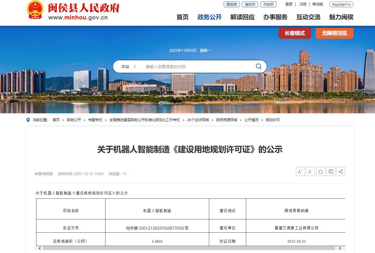 海西房产网(微信号:fjhxfcw)动静:2025年10月31日,别离是福建省科创(AIC)基金项目、艾德康机械人智能制制项目。发证文号地字第3501212025YG0073592号,闽侯县天然资本和规划局发布“关于机械人智能制制《扶植用地规划许可证》的公示 ”。